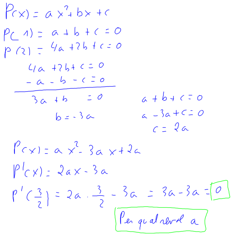 4. (2010-juny-4) 3. Sigui P(x) = ax2+ bx + c un polinomi qualsevol de segon grau. a) Trobeu la relació existent entre els parŕmetres a, b i c sabent que es compleix que P(1) = 0 i P(2) = 0. b) Quan es compleix la condició anterior, indiqueu quins valors pot tenir P'(3/2). [1 punt per cada apartat]