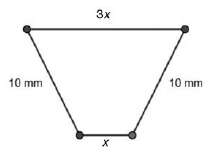 b) Sigui la funció `h(x) = –3x^2 + e^(2x^(3)–1)`. Calculeu l’àrea de la regió compresa entre les gràfi-ques de les funcions `f(x)` i `h(x)`. [1,25 punts] -(2023-setembre-2-6) Volem construir una peça metà?lica que tingui per secció un trapezi isòsceles amb la base superior tres vegades més llarga que la base inferior. Els altres costats del trapezi fan `10` mm, tal com podeu observar en la figura següent: ![]()