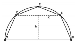 b) Quina ha de ser la distància (indicada en la figura per `h`) a què s’ha de situar la corda `CD` de `AB` per tal que l’àrea del pentàgon `ACEDB` sigui màxima? -(2019-juny-1-1) Les pàgines d’un llibre han de tenir cada una `600` `cm^2` de superfície, amb uns marges al voltant del text de `2` `cm` a la part inferior, `3` `cm` a la part superior i `2` `cm` a cada costat. Calculeu les dimensions de la pàgina que permeten la superfície impresa més gran possible. -(2019-juny-1-4) Considereu la funció `f(x)=(2x^3-5x+4)/(1-x)`.