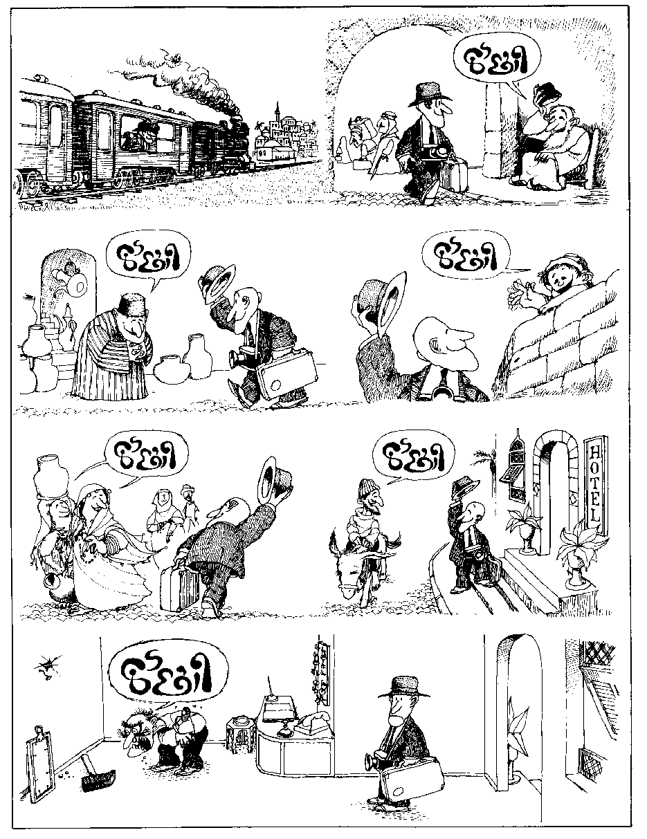 Aplica els anteriors i bàsics elements de la teoria de la comunicació a la historieta de Quino titulada "Gent al seu lloc". Hi veus diferents emissors, però només un receptor; un mateix codi, el verbal, i un mateix canal, l'auditiu. El missatge és el mateix; però ho és, també, el seu referent?