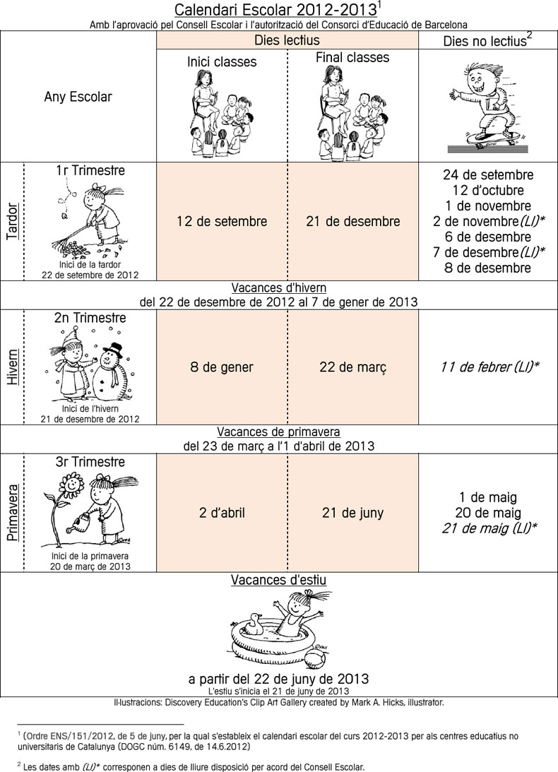 (Ordre ENS/151/2012, de 5 de juny, per la qual s'estableix el calendari escolar del curs 2012-2013 per als centres educatius no universitaris de Catalunya (DOGC núm. 6149, de 14.6.2012) Imprimir calendari escolar Agenda de l'escola curs 2012-2013