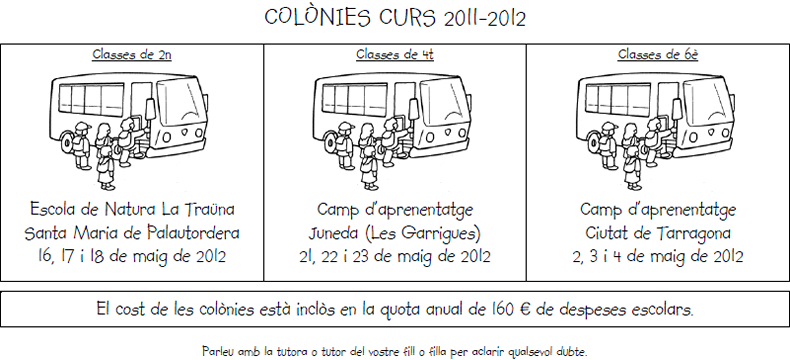 Per acord del Claustre del Professorat i del Consell Escolar, les colònies estan adreçades a l'alumnat de Primària del darrer curs de cada cicle: 2n, 4t i 6è. Els Camps d'Aprenentatge.