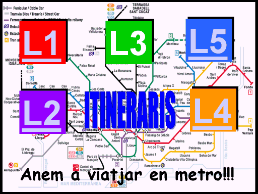 Itineraris en metro Material informàtic que simula la xarxa del metro de Barcelona. L'objectiu del material és exercitar aspectes que potenciïn l'autonomia dels alumnes dels centres d'EE a l'hora de poder planificar sortides, etc. Els continguts són les línies del metro una a una i els itineraris, amb o sense transbordament. El recurs tècnic va ser el programa Power Point creant una presentació per cada línia, on les diapositives són les estacions. Les presentacions enllacen entre si simulant els transbordaments de la xarxa de metro. Cada estació mostra el diagrama de la línia, amb els enllaços, una imatge i un text significatiu de cada estació amb una petita animació. Les imatges de les estacions poden ser fotografies de l'entorn, monuments, equipaments, il·lustracions relacionades amb el nom, etc. Els textos són rodolins o informacions. El joc comença en el vestíbul on hi ha una pantalla de presentació, es pot triar la línia a treballar o passar a una segona pàgina on es pot seleccionar una estació concreta. En seleccionar-ne una s'enllaça amb la presentació de la línia que permet anar endavant o endarrere. Les presentacions de les línies comencen amb un planell general i a continuació les diapositives de les estacions. A cada estació hi ha icones per anar a l'estació següent, a l'anterior i a la pantalla principal. En les estacions on hi ha enllaç apareixen icones de les línies que en fer clic porten a l'altra línia. El treball educatiu pot consistir en fer una exploració sistemàtica de les estacions o bé realitzar viatges virtuals per anar d'un lloc a un altre. El material és obert i les estacions es poden personalitzar de manera que les informacions siguin significatives per als alumnes. Per exemple, a la parada de l'escola, de casa seva o de casa els avis es poden posar fotos, textos o missatges de veu adequats. Aquests materials es molt voluminòs i tembé estarà disponible al Sinera Materials de Formació 2001 |
