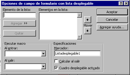 Situeu-vos dins el marc i seleccioneu el tipus de resposta: text, casella o llista Un cop dibuixat, la icona Opciones de campo de formulario permet modificat alguns paràmetres.