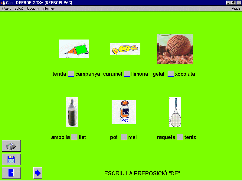 L'estructura de les frases i les preposicionsAquest grup es va proposar preparar activitats per treballar les preposicions utilitzant el programa Clic, adreçant-se a persones amb deficiències auditives. Aquest tipus de població troba una especial dificultat en l’aprenentatge de les preposicions, graduant-se els exercicis en taques de complexitat creixent. En una jornada van finalitzar 64 activitats per a treballar les preposicions a i de en diferents estructures lingüístiques.