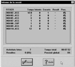 En l'informe d'activitat es mostra també el nombre total d'activitats fetes, el nombre d'activitats resoltes, el temps total esmerçat en la sessió i la mitjana de les valoracions obtingudes.