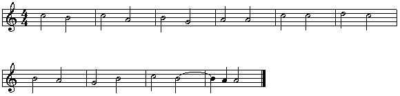 - Copiad éste fragmento en la pantalla. Cambiad a la voz 2. Escribid una segunda voz utilizando notas de la misma altura, pero de duración diferente. Escuchad las dos voces al mismo tiempo. Por ejemplo, donde hay un do blanca poned cuatro corcheras.