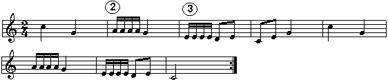 - Copiad en la pantalla la canción siguiente. Una vez la hayáis escuchado, escribid una 2a y 3a voz en forma de canon (textura polifónica). Los números en circulo indican donde han de empezar las voces. Por tanto, tenéis que completar el principio de la 2a y la 3a voz con silencios.