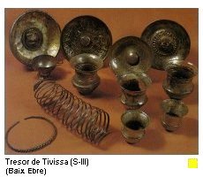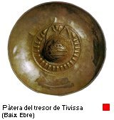 decorades amb caps de llop en altrelleu en el centre de la base. Aquests objectes de prestigi assenyalen l'existència al poblat del Castellet de Banyoles, a Tivissa, d'un lloc de culte important. Per la informació que ens dónen i la seva qualitat artística, les pàteres són els objectes més interessants: una porta una escena de sacrifici i d'ofrena a un personatge assegut en un tron, un genet a cavall amb llança i un lleó atacant un herbívor, tema d'antic origen oriental, tres personatges amb ales i un centaure; sembla tractar-se d'un sacrifici funerari
