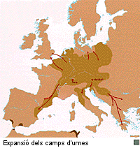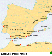 La formació de la civilització ibèrica Als voltant de l'any 1000 a.n.e., gent vinguda de l'altra banda dels Pirineus que parla una llengua indoeuropea i que coneix la metal·lúrgia del ferro, pel seu origen a la zona danubiana, a Centre Europa, es superposa sobre el substrat indígena del país, amb una cultura material del bronze i que no havia rebut aportacions estrangeres, sent, de fet, una pervivència de la població prehistòrica, la neolítica. ![]() A més de la llengua, aquesta gent centre europea porta un nou ritual d'enterrament, la incineració o cremació dels cadàvers, les cendres dels quals es col·locaran directament a terra dintre d'urnes de ceràmica, fet pel que rebran el nom de "pobles dels camps d'urnes". De tota manera, cal matitzar que la metal·lúrgia del ferro s'introduirà d'una manera molt lenta, i no la tenim plenament implantada fins al segle VI a.n.e., quan ja no només s'utilitza per a objectes de prestigi, sinó també per a instrumental agrícola i altres eines d'ús quotidià; aquesta àmplia difusió està relacionada amb la presència de comerciants grecs a la zona empordanesa. El bronze quedarà destinat als objectes de tocador, com les navalles, o d'ornament i ús quirúrgic. El canvi en la cultura material es deixarà sentir també en les formes i decoracions ceràmiques; les urnes solen tenir formes bicòniques, amb el cos carenat o arrodonit i porten tapadores en forma de plat de base plana. La decoració és a base d'acanalats, cordons decorats sobreposats i motius geomètrics incisos.Les cases dels nous vinguts són cabanes excavades en el sòl i amb coberta de fusta i argila sostinguda per pals clavats a terra, tenen petites dimensions i poden ser de planta oval o rectangular. Ara bé, amb l'arribada del poble dels camps d'urnes no n'hi hauria prou per explicar la formació de la cultura ibèrica. Un fet tan o més trascendent són els frequents viatges comercials que per les mateixes dates comencen a fer a les nostres costes els pobles navegants de la Mediterrània oriental, fenicis i grecs, o central, els etruscs. ![]() Decisiva serà la fundació de la colonia focea d'Empúries, al Golf de Roses, vinculada a la factoria de Marsella (Massalia), del mateix origen, al voltant del 600 a.n.e.. Amb anterioritat, els grecs de l'illa de Rhode havien fundat la ciutat del mateix nom una mica més al nord, on avui hi ha la ciutat de Roses.