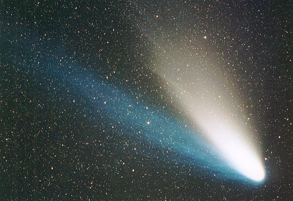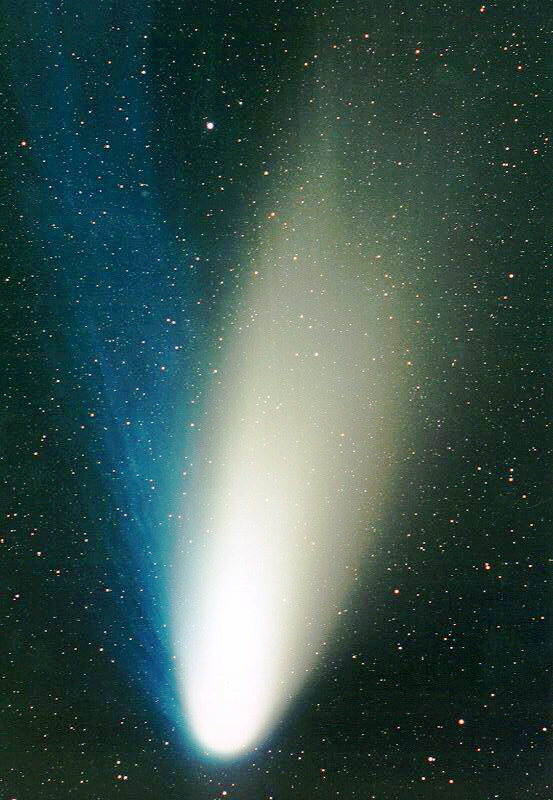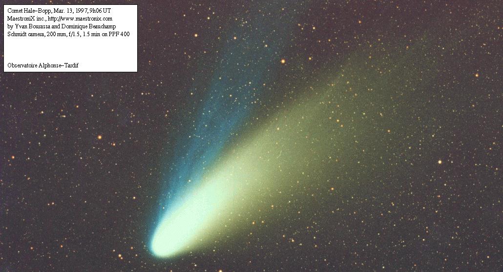 D'Arsiè and Gabriele Rosolen Localitat: Passo Giau (2230 mt), Cortina d'Ampezzo (Italy) Equip:Takahashi FS 102 f/6 - Kodak Gold 400 II hiper. 6 minuts d'exposició. La coma del cometa tenía magnitud - 0.6, amb una cua iònica que a ull nu tenia uns 15 g. de llarg i una cua difusa de pols d'uns 7 graus. |