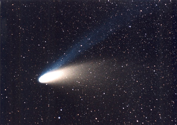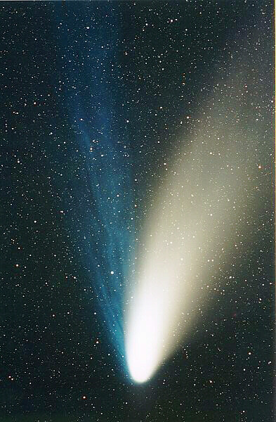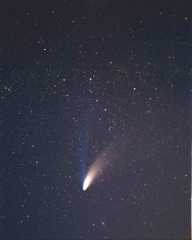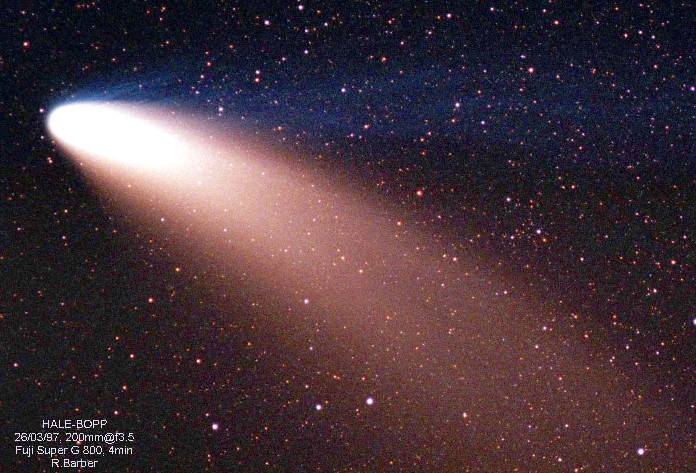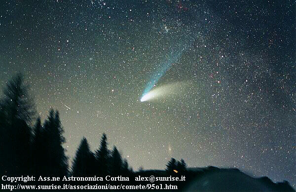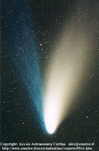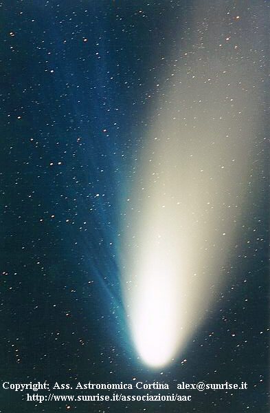 Renzo Volcan Astronomical Association of Cortina Localitat: Col Drusciè Observatory, Cortina d'Ampezzo (Italy) Kodak PRO Gold 400 II hiper film. Tres imatges del cometa Hale-Bopp fetes el 27 de març, 0.84 U.T quan es veia prop M31, la galàxia d'Andròmeda. El cometa tenía magnitud -1,0. A ull nu es veien ~18 graus de la cua iònica i ~12 graus de la cua de pols. |
