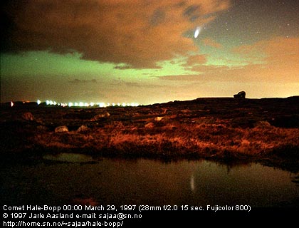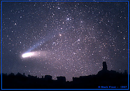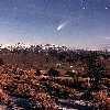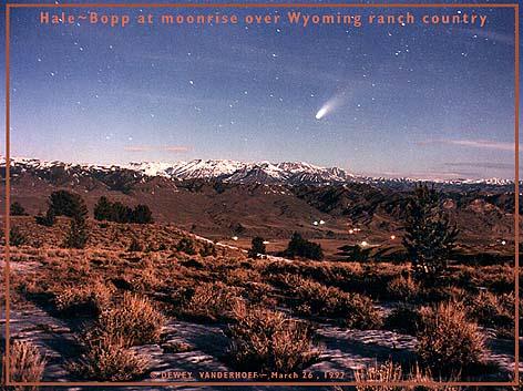 Autor: Dewey Vanderhoff Localitat: Sawmill Park, Wyoming. Equip: objectiu Nikkor 35mm f/2,8. Exposició: 52 segons amb Fuji Super G-400. Aquesta foto la vaig fer tres dies després de la lluna plena, quan començava a sortir la lluna. S'hi veu el cometa Hale-Bopp a sobre de Wapiti Ridge i dels camps que hi ha al llarg del ramal sud del riu Shoshone, al nord-oest de Wyoming. Està feta a Sawmill Park, a Carter Mountain, des d'un lloc a més de 2500 metres d'alçada... Les Absaroka Mountains del fons ténen més de 4000 m d'alçada. |