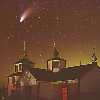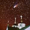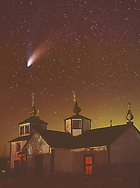 Autor:: Bill Hutchinson (hutch@corecom.net) Localitat: Kenai National Wildlife Refuge, Alaska Equip: Nikon N90 20mm f/2.8, 30 segons d'exposició amb Fuji 800HG. Esglesia ortodoxa russa de Ninilchik, un tema favorit de moltes fotografies. La nit era extraordinariament clara i transparent. La galàxia de Andròmeda s'hi veu clarament entre el Hale-Bopp i la cúpula de la dreta.