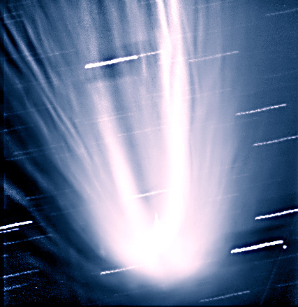 Ian Griffin Localitat: Astronaut Memorial Planetarium & Observatory, Cocoa (Florida) Equip: telescopi Maksutov 12" f/5 i càmera SBIG ST8. Filtre blau. La primera imatge és una exposició de 3 minuts del cometa Hale-Bopp. La resolució és de 18 micres per pixel. Camp de visió de 0,3 x 0,2 graus. Imatge processada per mostrar l'estructura de la coma. |