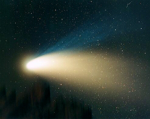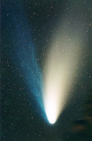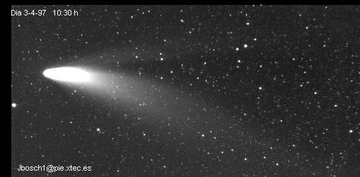 Cusinato i Davide Ghirardo Astronomical Association of Cortina Localitat: Col Druscie Observatory, Cortina d'Ampezzo (Italy) 2 minuts d'exposició amb pel.lícula Kodak PRO Gold 400 II hiper. Dues imatges del cometa Hale Bopp fetes l'1 d'abril de 1997. El cometa tenia magnitud -0,9. A ull nu es veien ~18 graus de la cua iònica i ~14 graus de la cua de pols. |