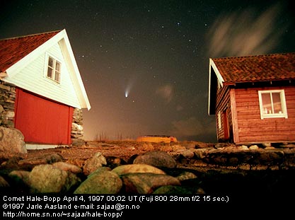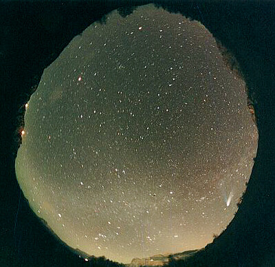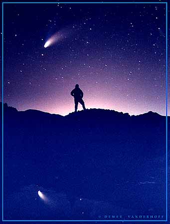 Hail! Hale BoppAutor: Dewey Vanderhoff Andy Frazier afegeix un toc humà a aquest retrar del Hale Bopp... El vam il.luminar breument amb un focus Krypton durant 3 segons a f/8. Llavors, vam obrir l'objectiu a F/2,8 i vam donar 45 segons més d'esposició. |
