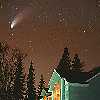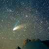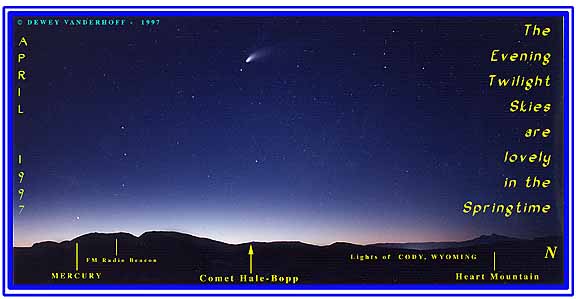 April TwilightAutor: Dewey Vanderhoff Vista del perfil nord-oest de Cody (Wyoming). A l'esquerra s'hi veu el planeta Mercuri, a punt d'amagar-se. Al mig, el Hale Bopp, i a la dreta, el resplandor de Cody i les distants muntanyes Heart i Beartooth Mountains. El missatge d'aquesta foto és aquest: No us fixeu només en el cometa... tot el cel que s'hi veu a la primavera és meravellós! |