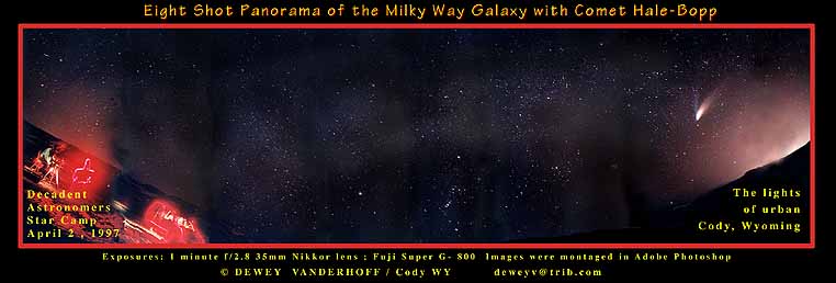 8X PanoramaAutor: Dewey Vanderhoff Vuit fotos de 3 x 5 muntades i digitalitzades en dues parts per crear una panoràmica del Camí de Sant Jaume visible en aquest moment, abastant des de l'horitzó nord fins als sud-est. A la dreta s'hi veu el cometa Hale-Bopp i la contaminació lluminosa de Cody (Wyoming). A l'esquerra s'hi veu el nostre campament (Decadent Astronomer's star camp). El trespeus es va orientar segons l'eix galàctic, cap a la constelació Draco, girant una mica a cada foto, de manera que es poguessin combinar després amb Adobe Photoshop amb una mica de retoc. Un experiment força interessant. Prometo treure-li profit... |