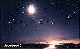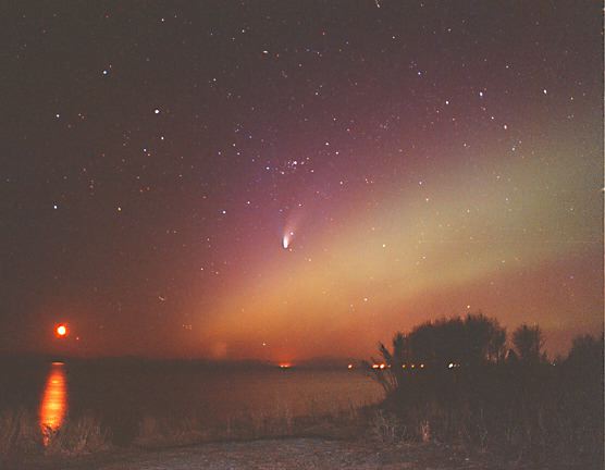 Autor: Bill Hutchinson (hutch@corecom.net) Localitat: Kenai National Wildlife Refuge, Alaska Equip: Nikon N90 20mm f/2.0, 30 segons amb Fuji 400 Super G. La matinada del dia 11 encara continuava l'espectacular aurora boreal. El Hale-Bopp s'hi veu envoltat per una cortina de color granat que baixa fins a juntar-se amb el resplandor dels llums de Kenai. Les constelacions i el reflexe de la Lluna afegeixen interés a aquesta completa fotografia. Copyright©