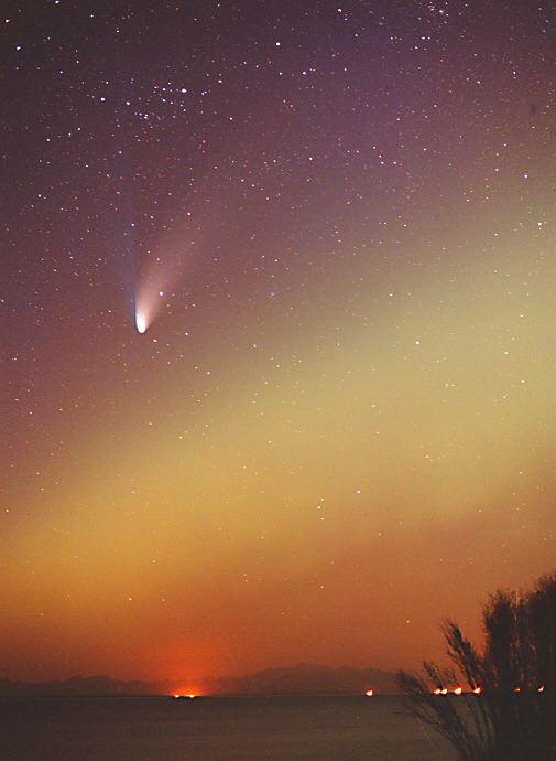 Autor: Bill Hutchinson (hutch@corecom.net) Localitat: Kenai National Wildlife Refuge, Alaska Equip: Nikon N90 50mm f/2.0, 20 segons amb Fuji 400 Super G. El dissabte 12 a les 2, encara que amb menys colors que divendres, l'aurora encara embolcallava el Hale-Bopp como una boira verdosa amb franjes de color violeta. Copyright©