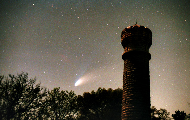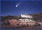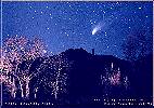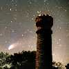 Hanon Localitat: Fort Oglethorpe, Georgia Equip: 50mm f/2.0. 30 segons d'exposició amb Fuji Super HG 400 La imatge mostra el cometa al costat de la Wilder Tower, un monument de la Guerra Civil al Chattanooga/Chickamauga National Military Park de Fort Oglethorpe. La Lluna, en quart creixent, il.lumina el paisatge. Es poden distingir uns 15 graus de la cua de gas. L'objecte rosat dalt a l'esquerra és la nebulosa California. |