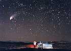 Una distracció més al costat de la carretera: autoretratObservadors: Dewey Vanderhoff, Mack Frost La Lluna, brillant i creixent, les Plèiades, Orion i el Hale-Bopp, semblen penjants sobre el fotògraf i la camioneta Chevrolet 1978 del seu amic Mack Frost, aparcada a Eagle Pass, als erms (badlands) del nord de Wyoming. El fotògraf surt il.luminat per una llanterna amb filtre vermell per visió nocturna fixada al seu braç... cal fer quelcom durant les exposicions llargues, per no congelar-se... |