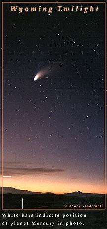 SpaceportObservadors: Dewey Vanderhoff, Mack Frost Aquesta foto va ser feta mirant cap a la carretera 14-16-20 de Wyoming. Cody està a uns 15 km, a una vall darrera de les muntayes. La Lluna, creixent de només quatre dies, apareix molt cremada, però fa molt bonic al costat d'Orion, les Plèiades, les Hyades, el Hale-Bopp i Cía. Mercuri s'havia amagat feia poc per l'horitzó nord-oest. La carretera s'hi vei i.lluminada pels cotxes que hi passen. |