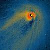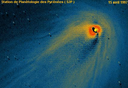 Un cometa amagat dins del cometa!Autors: François Colas, Jean Lecacheux Com la pols cometària il.luminada pel sol mostra la mateixa repartició de llum encara que es miri amb diferents filtres de banda ampla per l'espectre visible, és possible eliminar la cua de pols completament restant dues imatges digitals (CCD) fetes per diferents colors, sempre que les ajustem prèviament amb el coeficient de proporcionalitat correcte. Per obtenir aquesta imatge hem restat una imatge obtinguda amb filtre R (vermell) d'una obtinguda amb filtre B (blau), i amb aixó hem destacat la cua iònica, de color blau-violàci per la llum emessa pel CO+. La part propera al nucli queda eclipsada per l'esclat de la pols, i per aixó no es pot captar amb els mètodes convencionals fotogràfics. Només és possible fer-ho per processat d'imatges CCD mitjançant ordinador. Amb aquest mètode s'hi veu el cometa amagat dins d'un cometa. Està a l'abast dels astrònoms no professionals i permet un seguiment continuat de l'evolució de l'extensió i i morfologia de la cua iònica. No seria correcte, però, pretendre dedui la quantitat de CO+ emessa, car l'ió H2O+ emeteix llum vermella, que apareix en negatiu en ser restada! Per fer un treball científicament correcte caldria emprar costosos filtres de banda ampla per CO+ i per H2O+, i filtres contínus d'interferència.