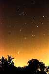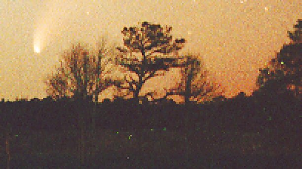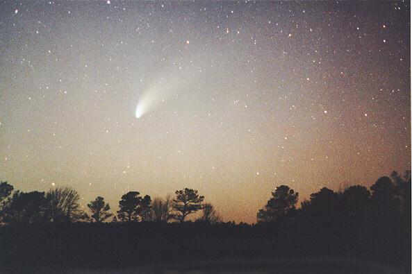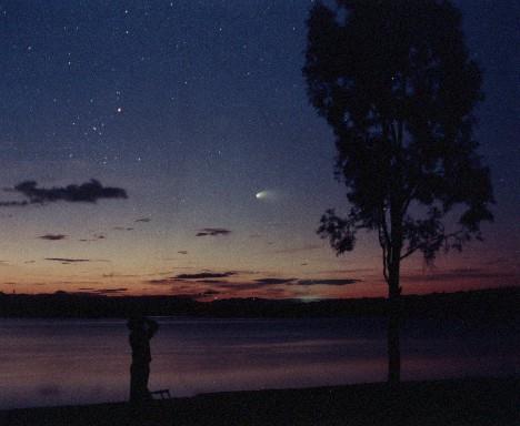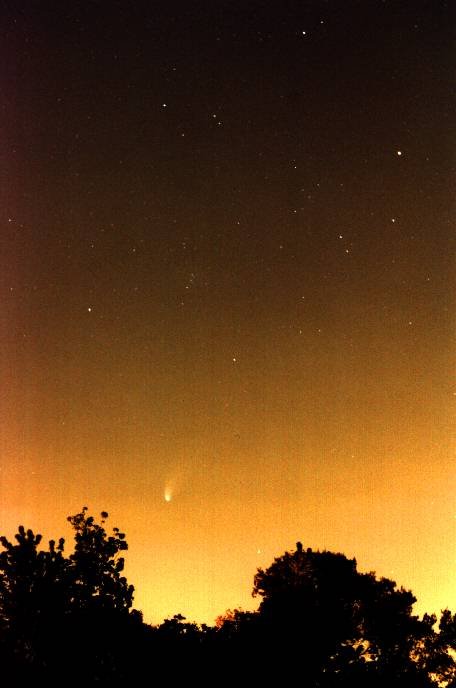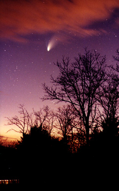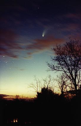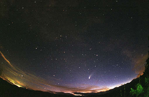 Autor: Bill Hutchinson (hutch@corecom.net) Localitat:Kenai National Wildlife Refuge, Alaska Equip: Nikon N2020 50mm f/2.0, 20 segons d'exposición amb Fuji 400 HG. La llum de la Luna ja no interfereix amb l'observació del cometa. Ara, però, tenim aun altre problema: a mida que s'acosta l'estiu, el Sol il.lumina l'horitzó durant quasi tota la nit als paisos que, com el nostre, es troben molt al nord. He fet aquesta foto prop de la una de la matinada perquè enteneu el que vull dir. Copyright©