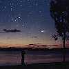 Camp CometObservadors: Dewey Vanderhoff Aquesta foto va ser feta des de Boulder Creek, a la branca sud del riu Shoshone al nord-oest de Wyoming, quan el Hale-Bopp s'amagava darrera d'Ishawooa Mesa. La camioneta descapotable VW Vanagon del meu amic Kent Houston serveix molt bé de camps base. Vaig il.luminar l'arbre amb un flash poc potent i la camioneta amb un focus amb filtres per llum blanca. Sense Lluna, es tornen a veure les cues. La cua iònica ja no s'hi veu més que de reüll, excepte des de lloc excepcionalment foscos, com aquest. Aquesta setmana sembla una mica més llarga la cua de pols, d'uns 18 graus, i molt més corbada. Jo la trobo més fotogènica que fa 10 dies. |