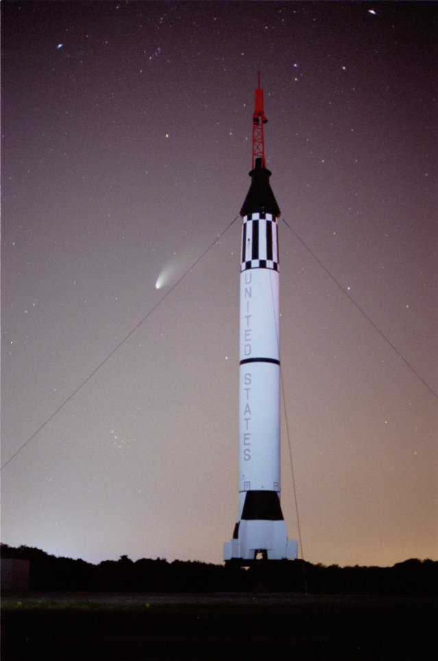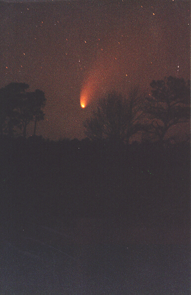 Observadors: Eric Rosen Aquestes són les meves millors fotos. Les vaig fer a la part occidental del Saguaro National Park, prop de Tucson (Arizona). Els originals ténen molt millor aspecte que aquestes imatges digitalitzades. Vaig il.luminar els cactus amb un flash. Com visc a Arizona, al vell sud-oest, em va semblar adient signar una foto del gran cometa de 1997 amb un cactus. Un saguaro fa guàrdia al deserto de Sonora mentre el visitant celestial del segle s'acomiada. |