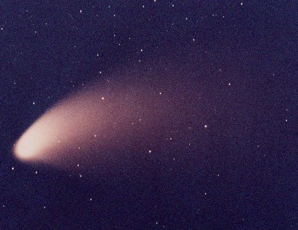 Author: Anthony Parra Location: L'Hospitalet del Llobregat, Catalunya (Spain) Optics: 55 mm f/2.8. Fuji 400 super G film . 45 seconds exposure. This image, taken from a 13th floor at l'Hospitalet, is my last photo of this comet. Hale-Bopp is barely visible here, as usual at this light polluted place. I covered the lens partially during 30 of the 45 seconds exposure, to avoid overexposing the bottom part. |