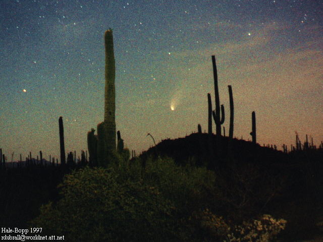 Autor: Bob DuBrall Localitat: Saguaro National Park, Arizona. Equip: 50mm, F2.8. Exposició: 20 segons amb Fuji 1600. THE END!!! El mateix lloc on vaig fer les fotos del 24/25 d'abril. Com ha canviat el Hale-Bopp en 21 dies! |