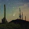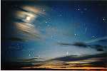 Observador: Mike Garnsey Localitat:Pierrepont Manor, New York Equip:Pentax, 28mm. Exposició: 15 segons amb Fuji Super G+ 800. Els dies anteriores hi havía molts núvols, i no vaig poguer fotografiar el cometa prop de la Lluna. El 12 va millorar el temps prou com per poguer treure'ls a la mateixa foto amb un angular. Hi havía núvols aquella nit a la costa oriental del Llac Ontario. Em sembla que van ajudar a que la foto fos més espectacular. |