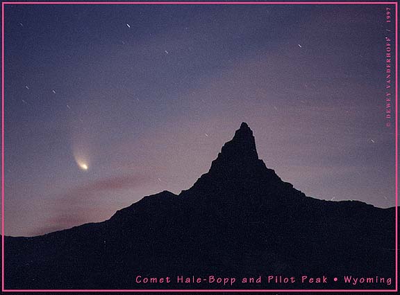 Pilot PeakObservadors: Dewey Vanderhoff, Andrew Frazier El Pilot Peak, semblant al Matterhorn i amb prop de 4000 metres d'alçada, és el més destacat del nord-oest de Wyoming. Es troba a les Absaroka Mountains, a ll'angle nord-oriental de Yellowstone Park . Només teníem 13 minuts des del moment en què el Hale-Bopp començava a veure's fins que despareixía sota l'horitzó. No penso demanar disculpes per les ratlles que han deixat els estels. |