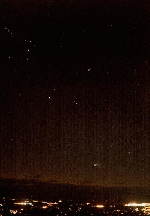 Autor: Keith Vincent Localitat:Hastings, New Zealand. Equip: Olympus OM-1 amb trespeus, 50mm f1.8. Exposició: 30 segons amb Agfacolor XRS1000. El cometa Hale-Bopp no pot competir amb els llums de Hastings, New Zealand (altitud 300 m), i s'ha convertit en un objecte crepuscular de dificil observació des de quasi tot arreu. |