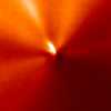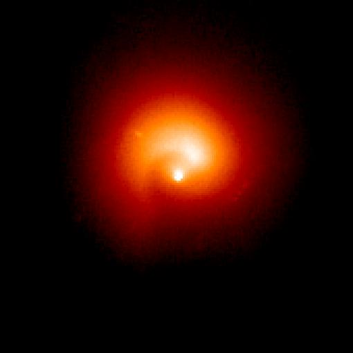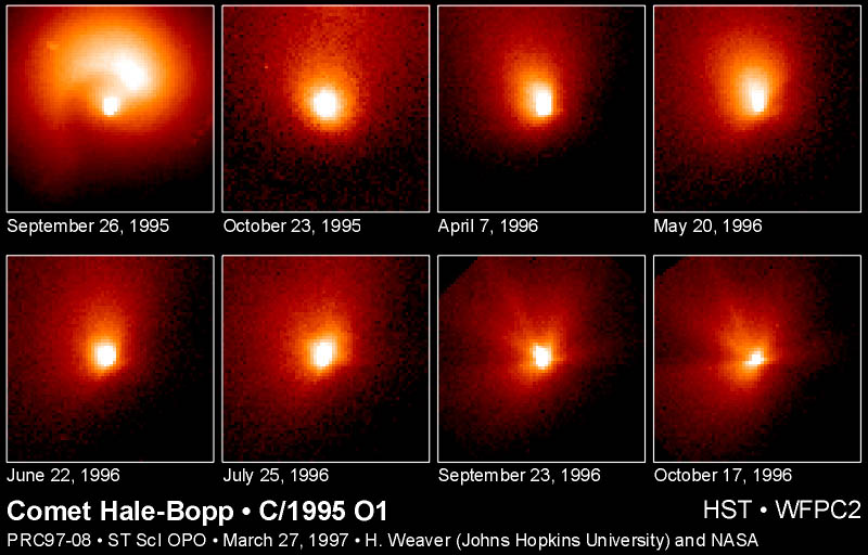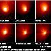 La primera imatge (dalt a l'esquerra) mostra una erupció de pols que va tenir lloc quan encara es trobava més enllà de l'òrbita de Júpiter. Les imatges fetes a la tardor de 1996 mostren A aquestes imatges en fals color, fetes amb la càmera Wide Field and Planetary Camera 2, les regions més fosques s'hi veuen negres, les més brillants blanques, i les d'intensitats intermitjes es representen amb diferents nivells de vermell.