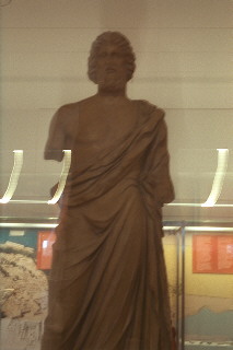 Reproducció de la imatge d'Esculapi. L'original és al museu d'Arqueologia de Catalunya en la seu de Barcelona. És de marbre de la pedrera del Pentèlic i de factura arcaitzant, tot i que deu ser del segle III a. Cr. Va ser trobada en tres fragments: bust, cos i bastó o bàcul amb la serp enroscada. Esculapi era un déu amb poders curatius i a Empúries hi tenia un temple, l'Asklepèion,amb una cisterna per a banys o ablucions sanitàries, que aquesta escultura devia presidir. Esculapi, en grec Asklépios, en aquesta representació té molta aparença de Zeus: un home madur, serè, barbat, de complexió molt ferma i amb una actitud hieràtica. Les faccions no són ben definides, no són les d'un retrat humà, perquè no se sap quina cara té un déu.
