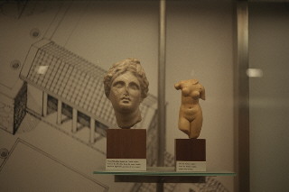 Restes d'imatges de deesses de l'amor, relacionades amb cases on trobaven gust els navegants, que només podien baixar en ports on trobessin una bona acollida, per la qual cosa romanien molt de temps embarcats. Els grecs d'Empúries eren foceus. Els foceus van continuar els viatges dels fenicis, que venien navegant fins a les costes occidentals de la Mediterrània a comprar metalls i a vendre objectes de luxe. O a bescambiar-los. En realitat, no devien provenir de l'orient de la Mediterrània, sinó de Marsella, aleshores dita Massalia, que era una base comercial que havien fundat a Occident. La navegació devia seguir la costa fins a les zones metal.líferes i mineres del sud de la Península Ibèrica. Al darrera de la testa podem veure el dibuix imaginat d'un edifici, temple o stoa, és a dir, lloc omercial porticat. Aquest edifici podia tenir un pis al damunt.