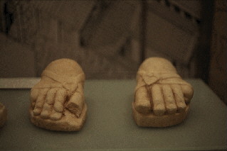 Fragments de l'estatua d'Esculapi. La torsió dels dits del peu esquerre permet pensar que l'escultura tenia una suau inclinació i actitud de caminar en sol.licitud vers el malalt quan era sencera. El calçat descobert insinua una actitud pacífica, perquè no permet córrer ni té la protecció ni la subjecció ferma del calçat de guerra o de treball. Tot això es corespon amb Esculapi, un déu taumaturg, dedicat a la salut. Cal remarcar el realisme i detallisme de l'escultor.