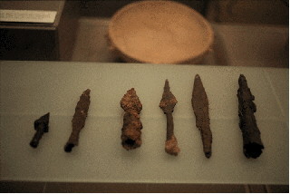 El ferro és un material que resulta deteriorat pel pas del temps. Aquí tenim sis puntes d'armes, testimoni no tant de violència com d'una estructura social en què hi havia "bellatores" o mantenidors de l'ordre. Abans les armes eren de bronze, però els indoeuropeus van perfeccionar el domini de la tècnica del ferro. Les armes de ferro tenien més duresa, no eren tan fràgils, s'esmolaven millor, permetien fer-hi soldadures i reparacions proporcionaven una recuperació del metall més fàcil per a noves foses. Tant els grecs com els celtes, integrants de la població autòctona, eren indoeuropeus.