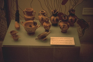 A les sepultures hi solien posar peces de ceràmica, objectes que el difunt havia usat en vida i que li havien donat gust. En aquest conjunt funerari emporità hi veiem quatre oinocoés o gerrets per a vi, dues amforetes (no de transport, sinó te taula), dos skyphos (a l'esquerra), un kylix (tombat, en primer terme), un ungüentari i un parell de peces més. Les vaixelles de servir a taula demostren una exquisidesa i una vida social molt desenvolupades. Excel.lents pintors ceramistes decoraven amb un estil peculiar cada peça. La ceràmica grega, apreciadíssima, era matèria de comerç i la desembarcaven a Empúries.