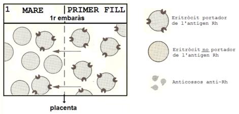 Els gràfics següents esquematitzen el procés a través del qual una dona Rh negativa s’immunitza en el primer embaràs (d’un fill Rh positiu) contra l’antigen Rh.