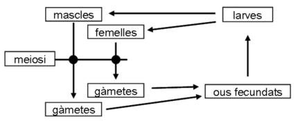 El musclo zebra (Dreissena polymorpha) és un petit mol·lusc bivalve originari de la regió pontocàspica (Mar Negre, Mar Caspi i Mar de l’Aral) que ha colonitzat regions europees occidentals. Des de fa uns quants anys ha envaït diferents hàbitats de la conca del riu Ebre i la seva capacitat reproductora causa un gran impacte sobre altres espècies i sobre infraestructures (canonades, canals, embarcacions, etc). Els musclos zebra poden ser mascles o femelles, la fecundació dels gàmetes és externa i una sola posta pot tenir fins a 40.000 ous. Dels ous fecundats surten larves planctòniques que es poden desplaçar per l’aigua. Unes quantes setmanes després de sortir de l’ou la larva es fixa a un substrat i es desenvolupa el musclo adult. | ||||||||||||||||