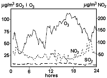 | El gràfic de la figura recull el registre de los concentracions de diòxid de sofre, ozó i diòxid de nitrogen a l'atmosfera d'una ciutat al llarg d'un dia. Se suposa que que el patró del gràfic es retepeix d'una forma forma constant la majoria dels dies a la zona i que no hi ha una emissió d'ozó per part de cap industria. | |