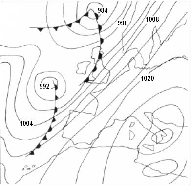 Utilitzant el mapa isobàric adjunt, responeu a les qüestions següents (dades en hPa).