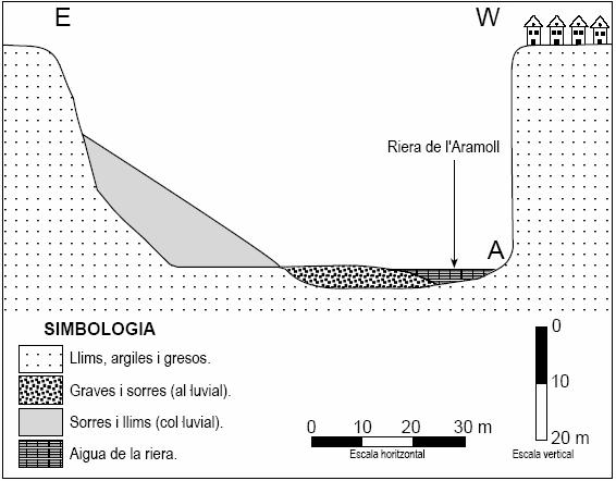 | Observeu el tall geològic realitzat a la riera de l’Aramoll. S’hi observa que les cases del poble, construïdes fa cinquanta anys a uns trenta metres en línia recta del talús de la riera, estan ara en situació de risc imminent de caure a causa del retrocés del talús. | ||||||||||||||||||