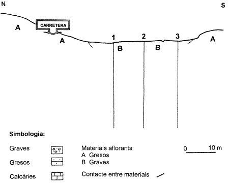 Fins a 7,5 m de fondària, graves; de 7,5 m a 12 m, gresos; a partir d’aquesta fondària calcàries.