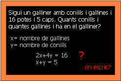 Problema del dia, del mes, de l'any, de sempre:![]() Si per resoldre un problema, el plantejament de qual, cal resoldre per Gauss un sistema de 4 equacions amb 4 incògnites i tenint en compte que la pissarra fa 2 metres per 1 metre 20. Es demana quina ha d'ésser la grandària de la lletra (Font ARIAL) que cal utilitzar per escriure les incògnites? Ampliació: Calcular els augments que ha de tenir les ulleres de llargavista que han de dur els alumnes de la segona fila per veure aquesta lletra en el "supositori" que el professor hagi estat capaç de fer el quadre puntillista a la pissarra que representa la solució de l'esmentat problema? Bé, no sabia com dir un problema que, suposo, tots el professors de matemàtiques si més no, hem de sofrir. El de la grandària de les pissarres. Qui sigui capaç d'inquibir la majoria de problemes (sense esborrar, enters) en les pissarres estàndard que tenim en els instituts que ho expliqui als altres. Però si sou dels que creieu que la grandària de les pissarres no és suficient envieu-me un e-mail. amb les dades següents: Nom: Assignatura: Centre d'ensenyament: tel (per si cal): Campanya: pro pissarres grans o dues pissarres a les aules Si hi ha un bon grapat de missatges procuraré fer-ho saber al Departament d'Ensenyament.